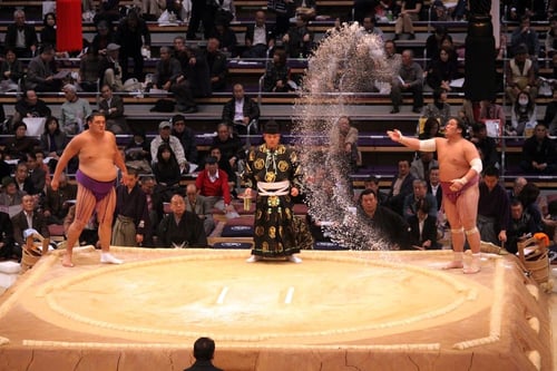 การแข่งขันซูโม่ ซูโม่มีประวัติยาวนานกว่า 1,500 ปี เป็นมากกว่าเกมส์กีฬาประจำชาติของญี่ปุ่น เพราะมันคือหนึ่งในวัฒนธรรมที่ตกทอดมาถึงปัจจุบันโดยยังคงรักษารูปเเบบวิธีในการปฏิบัติ เเละมีกลิ่นอายของความศักดิ์สิทธิ์ที่เกี่ยวข้องกับศาสนาอีกด้วย ซูโม่ในสมัยก่อนเป็นการแสดงประกอบพิธีกรรมหน้าเทพเจ้าตามความเชื่อของชินโต เพื่อแสดงความเคารพเทพเจ้าและเพื่อขอพรให้พืชผลออกดีในฤดูเก็บเกี่ยวอีกด้วย จนถึงสมัยเอโดะ ในสมัยนั้นได้เริ่มมีการจัดการแข่งซูโม่ขึ้นเพื่อหาเงินบริจาคสร้างศาลเจ้าหรือวัด คนธรรมดาก็เลยมีโอกาสได้ชมซูโม่ และนักกีฬาซูโม่มืออาชีพก็ได้ถือกำเนิดขึ้น จนพัฒนามาเป็นกีฬาซูโม่ที่เราเห็นอย่างทุกวันนี้