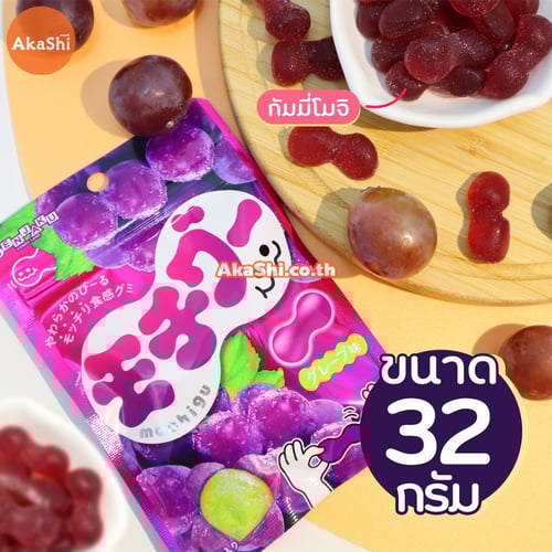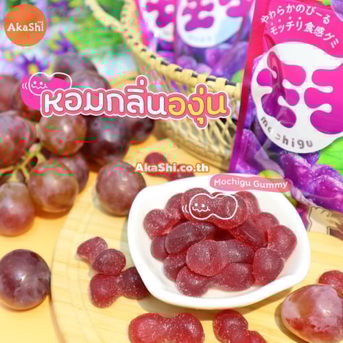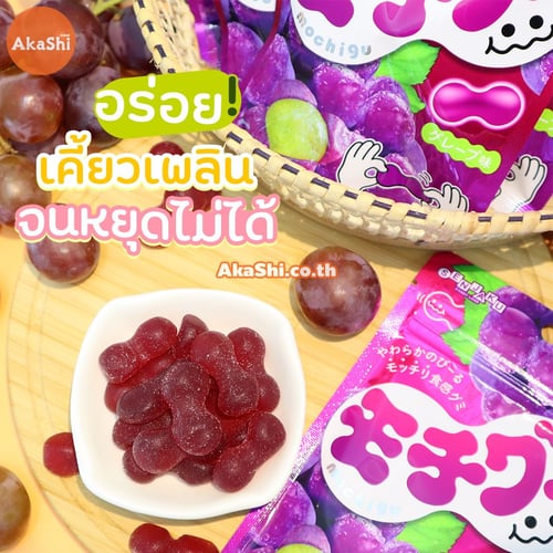 กัมมี่โมจิผลไม้ รสองุ่น เนื้อนุ่มละมุน หอมกลิ่นองุ่น ใช้วัตถุดิบเป็นน้ำองุ่นแท้ ผสมในวุ้นเจลาติน