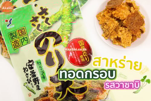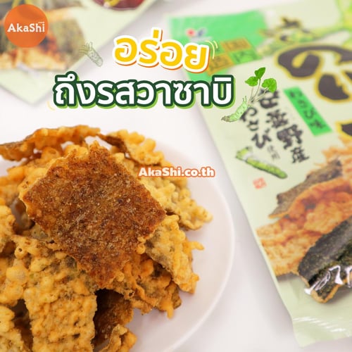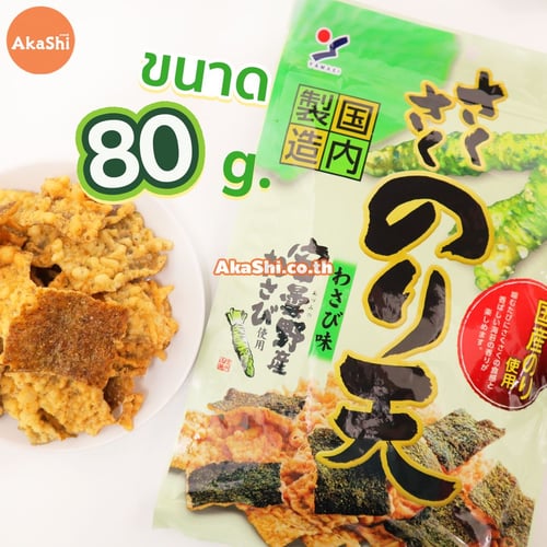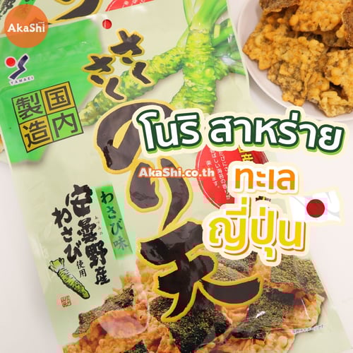 Yamaei Sakusaku Noriten Fried Seaweed Wasabi - สาหร่ายทอดกรอบ รสวาซาบิ สาหร่ายโนริหรือสาหร่ายทะเลญี่ปุ่น เป็นสาหร่ายทะเลแห้งที่นิยมใช้เป็นวัถุดิบในอาหารญี่ปุ่น มีสีเขียวเข้มจนถึงดำ นำมาคลุกด้วยแป้งเทมปุระ ทอดจนกรอบ ได้คุณประโยชน์จากสาหร่ายทะเลเต็มๆ ทั้งแคลเซียม แมกนีเซียม โพแทสเซียม ธาตุเหล็ก และใยอาหาร รสวาซาบิ ถึงเครื่องสไตล์ญี่ปุ่น ทานได้ทั้งเด็กและผู้ใหญ่ กรอบ อร่อย ทานเพลิน ทานได้ทุกที่ ทุกเวลา