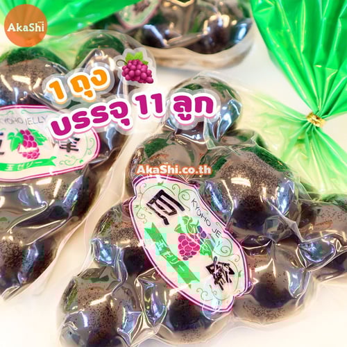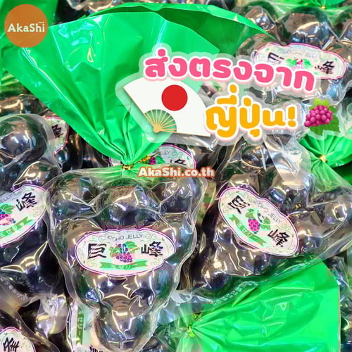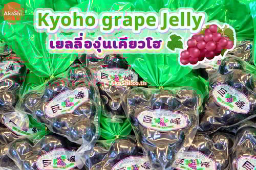 Kyoho Grape Jelly เยลลี่องุ่นเคียวโฮ เยลลี่ยอดนิยม จากประเทศญี่ปุ่น เป็นเยลลี่รสชาติองุ่นเคียวโฮ องุ่นสายพันธุ์ชื่อดัง ซึ่งได้รับความนิยมอย่างมากในกลุ่มผู้ที่ชื่นชอบการรับประทานองุ่น และเป็นของฝากยอดนิยมของชาวญี่ปุ่น ขึ้นชื่อเรื่องความอร่อย ลูกใหญ่ เนื้อฉ่ำน้ำ มีความหอมหวานที่เป็นเอกลักษณ์เฉพาะตัว มีการคัดเกรดหรือคุณภาพ ซึ่งหากคุณภาพดีราคาก็จะสูงตามไปด้วย มาในรูปแบบขนมเยลลี่ลูกใหญ่ ที่จำลองลักษณะมาจากองุ่นเคียวโฮจริงๆ หอมหวาน ฉ่ำน้ำ อร่อยเต็มปากเต็มคำ ได้รสชาติขององุ่นเคียวโฮแท้ๆ วิธีรับประทาน เพียงนำไม้ปลายแหลมหรือไม้จิ้มฟัน มาจิ้มไปยังตัวเยลลี่ เพื่อให้พลาสติกที่ห่อหุ้มเยลลี่ไว้ให้ขาดก่อน ก็จะได้เยลลี่เนื้อเด้ง หวาน ฉ่ำ สุดอร่อย พร้อมรับประทาน สามารถนำไปแช่เย็นเพื่อเพิ่มความอร่อยที่มากยิ่งขึ้น
